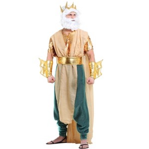 The Fun Costumes Men's Poseidon CostumeReady to rule the ocean? You can step up as the Greek god of sea when you slip into our exclusive Adult Poseidon Costume. Designed with extra attention to detail, this is a style you're not going to find available from any competitor. And that's because it's Made by Us, crafted right in our own studios by our own team of artists, designers, and developers. With quality and durability that's sure to stand out, this costume will ensure a memorable costume experience.Product Design:We designed this exclusive costume as a cape that's worn over a shirt and pants set. The faux linen cape drapes over the bronze sequined shirt and organza pants, secured by a gold polyfoam belt. Gold polyfoam cuffs and crown add necessary accents, giving this costume a powerful and regal appearance.Product Details:Short-sleeved pullover shirt is fully linedShirt shell is mesh covered with bronze sequinsPants have elastic waistband, billowy organza overlayFaux linen cape drapes over shoulders & is secured by beltMetallic gold foam belt has hook & loop fastener at backFoam crown has elastic band at backFoam wrist cuffs slide onAbout Us:Fun Costumes are exclusively Made by Us and begin with passion, teamwork, and industry expertise decades in the making. Our products are proof that with the right people even a simple idea can grow into something incredible. We started in a small garage in Minnesota, providing costumes to our local community, and now we're creating costumes for people all around the world.
