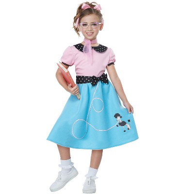 If you're looking for a 50's ensemble for your child, this costume has a bright and cheerful yet classic appeal. The checkered shirt with its peter pan color and cuffed short sleeves would have fit in well in the hall of a 1950's high school. This poodle skirt with tulle hem has an instantly recognizable look, perfect for swing dancing. In this ensemble, it won't be long until she's doing the !
