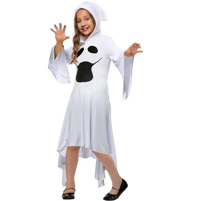 Who says you can't be spooky and fashionable at the same time! Get a bit of both with this Gorgeous Ghost Girls Costume. This ghost-white hooded dress features an appliqued ghost face on the front. It has flared hanging sleeves and a handkerchief hemline. It closes in the back with a hook and loop closure for a spooky look for Halloween.