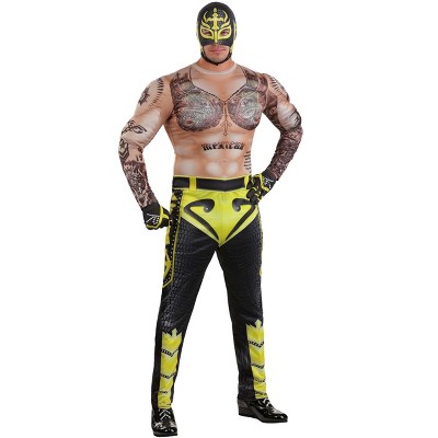 If you want that old-school circus feel for your next costumed event then you'll like this strongman outfit. The striped suit is instantly recognizable as that uniform of strongmen in days gone by. The sleeves and legs are covered in Americana nautical tattoos. Detailed with a faux leather belt and wristlets all you'll need is an epic mustache and you'll be ready for your future in the circus.