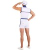 This men's sailor costume features a sleeveless jumper that is trimmed in navy blue and has classic gold anchor motifs throughout. It has a sailor collar complimented with a navy ascot. The romper zips up the front and is cinched around the middle with a blue belt. The shorts are cuffed and have two pockets at the back that are decorated with that matching anchor motif.