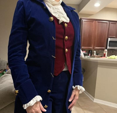 Get ready to become a Founding Father of American History when you choose this Thomas Jefferson Costume. Our exclusive design, it comes with a one-piece jacket/vest combo, pants, and a neck cravat. The brilliant blue theme is accented with the burgundy vest front and white trim on the cuffs along with the cravat add a touch of sophistication.