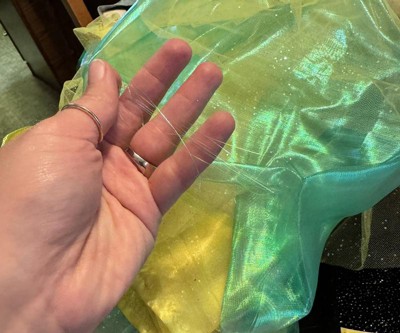 Magical Details: This bug-inspired outfit features a glittery velour top with a convenient zipper down the back for easy dressing. Delicate sheer nylon sleeves and layers of yellow tulle and green organza add an elegant touch, while the satin-trimmed glitter velour wings on the back give this costume a whimsical flair. The foam-backed body piece completes the look with a realistic and enchanting touch.