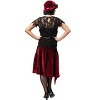 Going to a jazzy soiree? Well, if you're looking to dress to the nines, 20's style then this classy ensemble might suit your needs. The bodice is drop-waisted with a rich black lace overlay. The asymmetrical velvet skirt matches the black and red velvet hat. Whether you're going to a speakeasy or you're an upstanding citizen you'll certainly be the bee's knees!