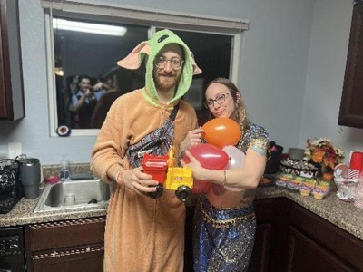 This gorgeous two-piece genie costume is a magical pick for any costume party. The crop-top buttons up the front and is trimmed with gold coins. The matching pants have a short zipper down the back to make slipping into these pants easy. A mysterious gold-trimmed veil tops off this mythical look, tying around the back of your head to keep it in place.