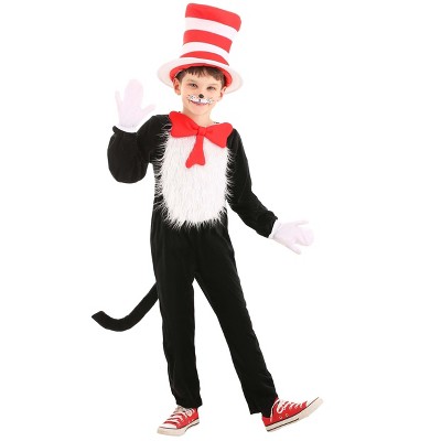 World RenownOver the years, Dr. Suess has become a household name. One day he walked out the door and everyone was tipping their hat to him and muttering about green eggs and ham! Little did he have a clue: when he uttered the words, "Look at me, Look at me now," he uttered them for those who are !Not only do they encompass so much of what it means to enjoy Halloween—or any party, for that matter—but it is the perfect literary quote to blurt out when you find yourself itching for the spotlight. Yell it in the kitchen and then act out Green Eggs and Ham, or something.We recommend keeping it simple with a little dance. That is unless you are comfortable balancing on your appendages: a cup and some cake, the fish and a rake, some milk in a dish, and a little toy ship—all while bouncing on a ball. No pressure.Design & DetailsThis Cat in the Hat Child Premium costume comes with everything your little one will need to bust a move as literature's greatest feline. The black jumpsuit comes with an attached red bow tie, a sewn-on black tail, and the legendary red and white striped hat! Additionally, it features a fur-lined face-opening and a fuzzy belly. Best of all, this bad boy is officially licensed and exclusive, which is like a Dr. Suess-approved costume you can only get here! Ready for mischief, shenanigans, and maybe a mess?