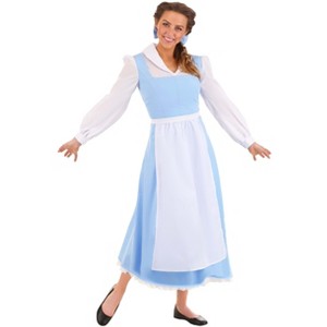 Disney's Beauty and the Beast Blue Dress Belle Costume for Women:Perhaps it's time to venture out of your small village in this Disney's Beauty and the Beast Belle Blue Dress. It's officially licensed from the classic animated Disney movie and features a dress that has a lace-up back and a fitted pinafore-style top. The white apron and blouse will make you look right at home while you daydream and twirl in the French countryside. Complete with a beautiful blue bow to tie back your hair, this smart yet romantic look will make feel like you’ve stepped straight out of a fairytale!Product Details:White dress: 97% polyester, 3 % cotton; Blue dress & hair bow: 99% polyester, 1% cotton; Apron: 100% cottonWoven poly cotton white pullover dress has single button closure on the collarSingle button closure on the cuffs of the sleevesWoven poly cotton light blue dress has zipper down side seamBlue suede lacing through grommets on the back of the blue dressWhite apron ties around the waist as desiredBlue hair bow has a black elastic band to secure in your hairOfficially licensed Disney Belle Costume. About Us:Fun Costumes are exclusively made by us and begin with passion, teamwork, and industry expertise decades in the making. Our products are proof that with the right people even a simple idea can grow into something incredible. We started in a small garage in Minnesota, providing costumes to our local community, and now we're creating costumes for people all around the world.
