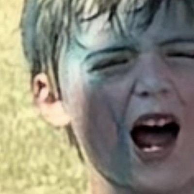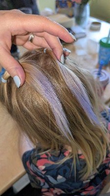 kid still happy to have colorful hair, but he wanted purple not blue.
