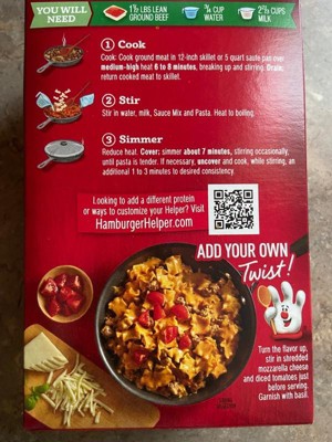 America’s favorite Hamburger Helper is made with 100% REAL cheese and Italian-style herbs for the classic taste you love most. Make Hamburger Helper in three easy steps; simply brown beef, stir in ingredients and pasta sauce and simmer. Add Your Own Twist! Turn the flavor up! Stir in shredded mozzarella cheese and diced tomatoes just before serving. Garnish with fresh basil. BOX CONTAINS: 5.5 oz box