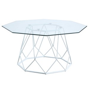 Unveil the shades and engage nature indoors. The sunshine will reflect beautifully off the tempered glass tabletop. This modern octagon-shaped coffee table sits on steel support with a complex geometric design. Choose between a modern black, neutral dark gray, or minimalist white finished table. The open and airy base design evokes a friendly environment in the living room or home office.