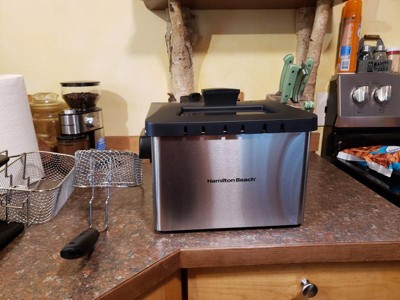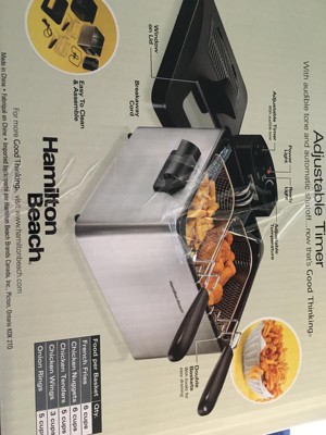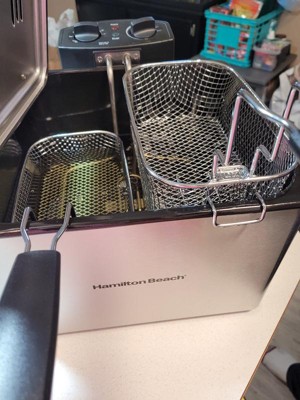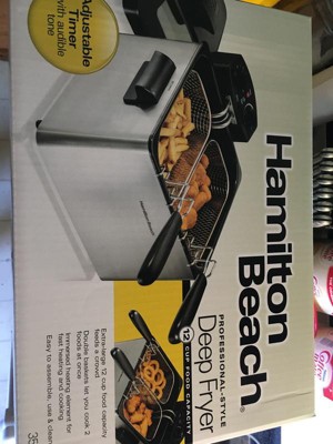 Get crispy, golden results in your own kitchen with the Hamilton Beach® Professional-Style Deep Fryer. Inspired by commercial fryers, this easy-to-use home version features a large 4.7 quart (19 cup) oil capacity for frying up to 12 cups of food at the same time. With this large-capacity deep fryer, you can make batch after batch of restaurant-quality food without the messy splatter. For maximum versatility, it comes with 2 chrome-plated frying baskets, which let you fry 1 or 2 foods at the same time. Expertly prepare all your deep-fried favorites including French fries, chicken tenders, nuggets and wings, cheese sticks, onion rings, doughnuts, battered vegetables and much more — it's not only easier than using a pot on your stove, it's less messy. After frying, the enamel-coated oil pot, baskets and lid all go in the dishwasher for easy cleanup.
