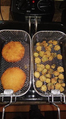 [This review was collected as part of a promotion.] First off I love this deep flyer, I have a family of 6, and cooking french fries for a family of 6 this comes in hand. I can cook enough fries for everyone at once. Another great thing is if it's just me and the husband I can cook chicken strips on one side and french fries on the other. It heats up pretty quickly. I love that it has a green light that lights up to let you know it is ready. This deep flyer also has a timer, So you can set the timer and it will stop cooking. It cleans up easily. We have cooked okra, onion rings, french fries, hush puppies, fish, chicken, and many other things. Everything comes at great. Crispy on the outside and moist inside. Overall this is a must for families. It comes in hand a lot in my home.
