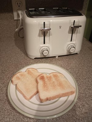 [This review was collected as part of a promotion.] This 4 slice toaster is excellent. The design is sleek and modern. Looks wonderful on my counter. The slots are extra-wide for thick bread or bagels. The toast pops nice and high for easy removal. The knobs are accurate for toast color (toasted level). I like very well done toast and my husband likes barely toasted, this allowed us to both be happy with our morning toast!