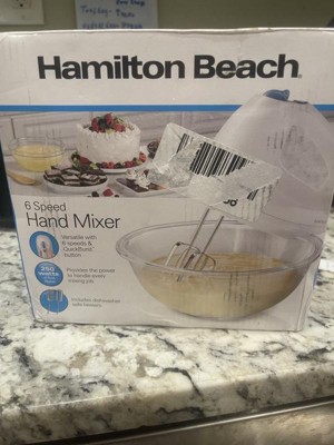 The Hamilton Beach® 6 Speed Hand Mixer is designed for fast, easy mixing. It features 6 speeds and a QuickBurst™ button for extra power when you need it at all mixing speeds. It easily handles a variety of ingredients, from chunky foods like nuts to dry flour and creamy butter, and is sure to become your favorite, go-to hand mixer. It comes with two traditional beaters, so you can start mixing right out of the box. Simply press the speed dial to release the dishwasher safe beaters from the mixer for fast cleanup, without getting your hands messy. The unique Bowl Rest™ feature frees your hands by stabilizing the mixer on the edge of the bowl when the mixer is not in use, so drips end up in the bowl and not on your countertop. The hand mixer has 250 watts of peak power to easily handle every mixing job, whether you're adding nuts and chocolate chips to cookie dough or fluffy whipped cream. It whips, beats and mixes ingredients with ease, whether you're making delicious nut-filled brownies or a big batch of peanut butter cookies.