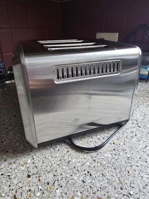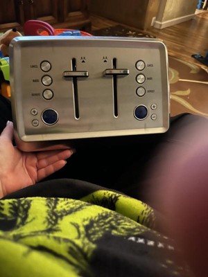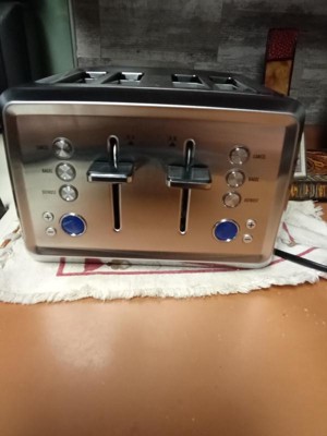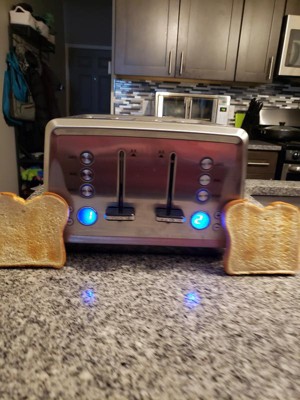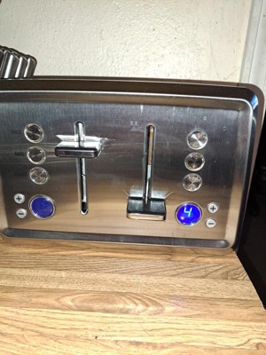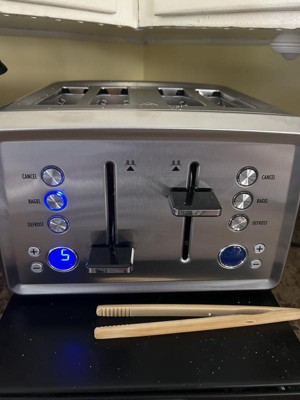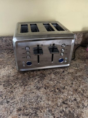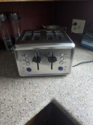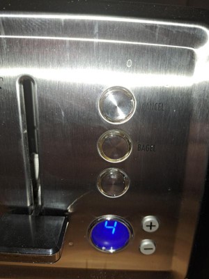 [This review was collected as part of a promotion.] It is a beautiful toaster right out of the box. Pros: 1. You can make 4 slices of toast at the same time with different settings. 2. It has a defrost setting. My son wanted a bagel but they were frozen. He was able to put it in on defrost and had his bagel in no time. 3. They bagel setting only cooks one side of the bagel. 4. The slots are really wide to hold big slices or bagels. I no longer have to squish my bagels down to fit it in my toaster. 5. The digital number display is great so you know what number to cook your toast. My old one had a knob and it was difficult to determine the correct setting. 6. The crumb trays make it easy to empty the crumbs. 7. It looks beautiful on my counter. Cons: 1. The first few times you use it, it smells like something is burning. There should be a warning about that. I thought I had left pieces of packaging inside at first. 2. The setting resets to 4 after each use. I like my toast at 6 and I have to change the setting each time I use it. 3. It is difficult to see the buttons without leaning down to the counter level to read it. 4. It gets finger prints on it really easily so it needs wiped down all of the time. Overall I highly recommend this toaster. It works well and looks great.