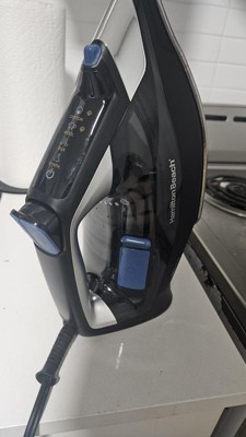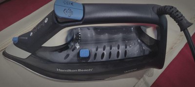 [This review was collected as part of a promotion.] I’m impressed with the amount of steam this iron provides and adjusting the heat levels on this steam iron is easily recognized with the light up touchpad and audible tone. I’ve never owned an iron that had this many steam outlets on the sole plate and the steam blasting button gives an extra burst of steam like I’ve never experienced. Compared to my last Hamilton Beach iron it feels lighter but it has great balance and heft when filled with water. It easily works out wrinkles on my work shirts. Filling the iron is a shortfall on this one as you need to hold the (hot) iron level and off the surface with one hand while pouring water or turning on the tap with another. My last HB iron rested on the heel when filling, leaving the hot sole plate vertical and off the ironing board when filling. I most often end up filling my iron while heated and in use, and filling this unit requires two hands instead of my usual option of setting the iron upright on its base and filling it with a pitcher or repurposed water bottle. It’s a great iron but refilling it could have been done thought out better.