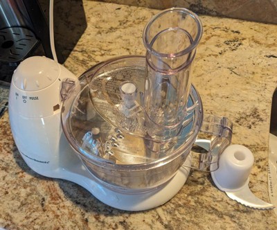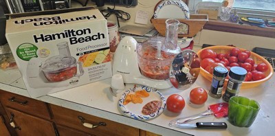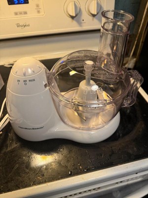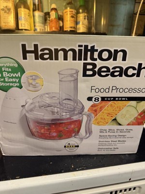 [This review was collected as part of a promotion.] This Hamilton Beach food processor really surprised me honestly. It's more elongated than tall, so right off the bat, it's easy to store in any shaped cupboard. The 8 cup capacity lets you blend a large amount of food in the tray. I use it a lot for hummus, tomato sauce, soups, or simply chopping lots of cabbage for cole slaw. It comes with a slicer/grater blade to use as well. Shredding cheese is a breeze. Clean up is easy, its dishwasher safe minus the electric part. The feed chute also can be turned into the bottom part for especially small places. It's very powerful and chops through whatever I needed it to. Overall, this is an excellent food processor I highly recommend.