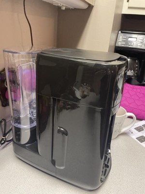 [This review was collected as part of a promotion.] We really love this coffee maker. I love the way it's all inside when you have it sitting and it keeps it warm instead of going in an hour later and drinking coffee that tastes like it was in a fire pit for a day. I go in 2 hours later and the coffee is still tasting great and it's still warm. Another great feature is that you can remove the fill container and fill it to the level you want from the tap instead of having to fill the coffee pot and then pouring it into the fill container. I also use the timer on a daily basis. It also counts time upward since you last made the pot of coffee. No more guessing on how long the coffee has been sitting in the pot. The filter basket is on the top which makes it easier to add the grains. I have absolutely nothing negative to say about this dispensing coffee maker.