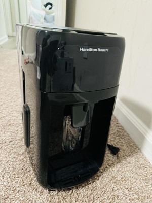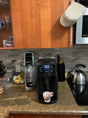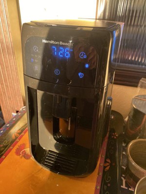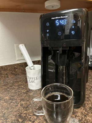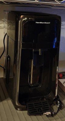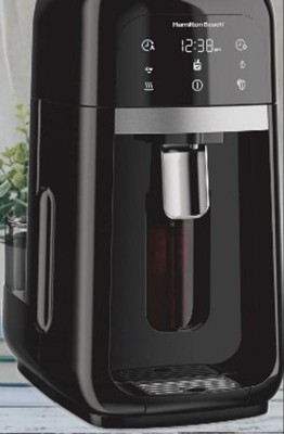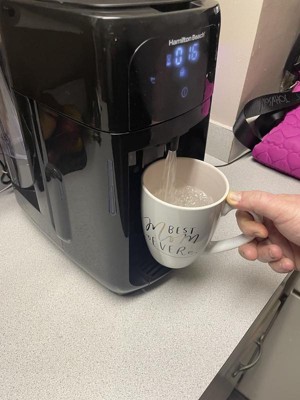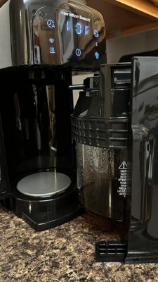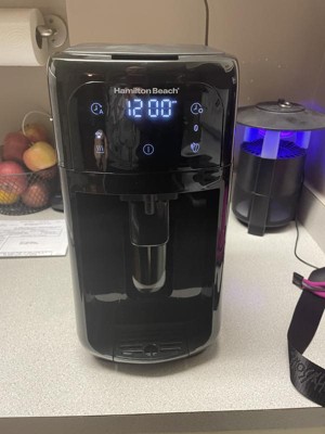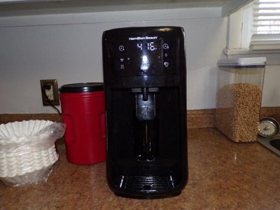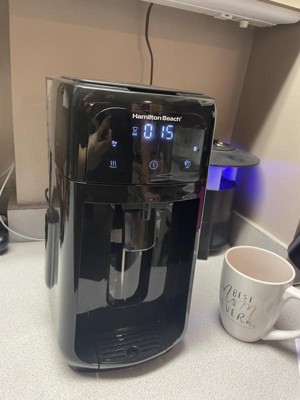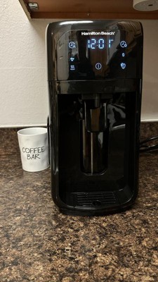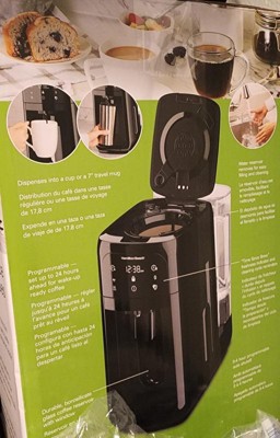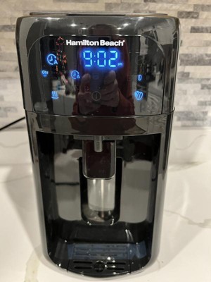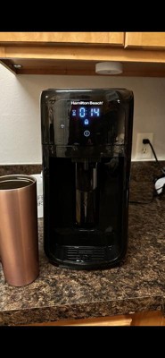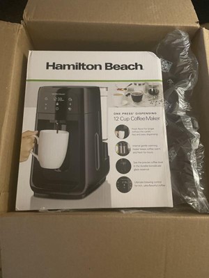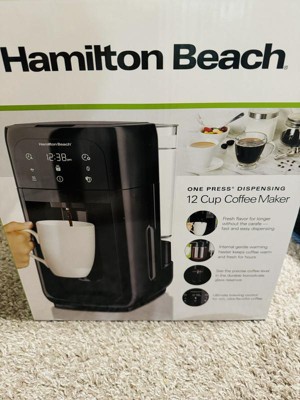 Enjoy fresh flavor for longer with the Hamilton Beach® One Press® Dispensing Coffee Maker. It conveniently dispenses fresh, delicious coffee into your favorite cups or travel mugs up to 7" tall with one press of the lever. Since there's no carafe, there's no spilling, pouring or making a mess. The internal warming heater keeps coffee warm and fresh for hours in the durable borosilicate glass reservoir where coffee won't burn or scorch. The front-facing window lets you easily see the coffee level in the 12 cup coffee reservoir. Programmable settings give you ultimate brewing control. The brew strength selector has 3 options: bold, regular and 1-4 cups for making small batches of coffee. The programmable clock is easy to use and can be set up to 24 hours in advance for wake-up ready coffee. The "Time Since Brew" freshness indicator tells you the time since coffee brewed, and programmable auto shutoff turns the coffee maker off in case you forget. Automatic reminders alert you when it's time to clean the coffee maker and replace the water filter. The clear, removable water reservoir is easily accessible. Just remove and fill at the sink. It is easy to rinse clean.