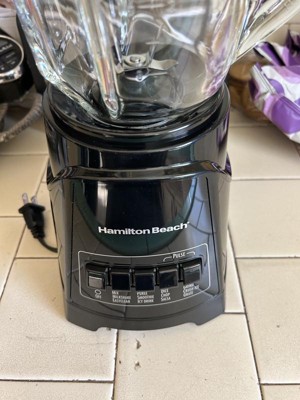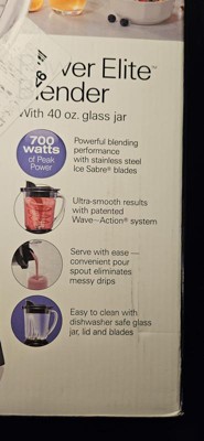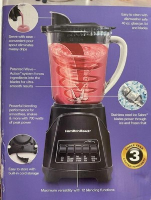 The Hamilton Beach® Power Elite™ Blender delivers ultra-smooth results every time you blend. With 700 watts of peak blending power and stainless steel Ice Sabre® blades, you'll have all the power you need to blend smoothies, protein shakes, frozen drinks and more. The blender's patented Wave~Action® System continuously forces ingredients down into the blades and circulates them around the jar — thoroughly crushing the hardest contents with ease. Serving is easy because the patented pour spout on the jar eliminates messy drips. The large 40 oz. glass jar holds multiple servings, and for easy cleanup, the jar, lid and removable blades are all dishwasher safe. Twelve functions controlled by 5 simple buttons give you all the versatility you need to blend, puree, dice and chop. Blend smoothies and shakes, crush ice, puree vegetables and fruits, chop vegetables for salsa and much more. The cord stores neatly inside the base of the blender when it's not in use for easy storage. Built for long-lasting performance and backed by Hamilton Beach with a 3 year limited warranty.