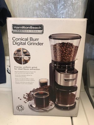 If you're dedicated to great-tasting coffee, grinding whole beans right before brewing is key. The Hamilton Beach® Conical Burr Digital Coffee Grinder provides precise, uniform grinding for excellent coffee extraction cup after cup. Its 39 grind selections let you expertly grind everything from coarsely ground French press to finely ground espresso. The hands-free automatic operation lets you grind just enough beans for the number of cups you want to brew and it turns off automatically so there's no need to tend the machine. If your brewing method calls for exact measurements, the built-in scale and easy-to-read digital screen let you automatically grind to a specific amount of ounces or grams. If you want total grinding control, the manual mode is ideal for you. With manual grinding, you control the timing yourself and even better, you have the option to grind directly into your own portafilter using the unique portafilter holder. Whichever grinding option you choose, the Hamilton Beach Professional Conical Burr Digital Coffee Grinder always provides precise control.
