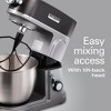 - DURABLE STAINLESS STEEL 5 QUART/4.7 LITER MIXING BOWL. Made to withstand every mixing task and features a handle to make it easier to remove the bowl. Convenient splash/pour shield fits on top of the bowl to help prevent splatters.