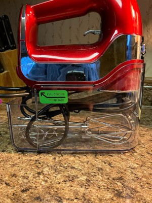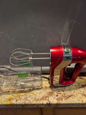 Mix any recipe effortlessly with the Hamilton Beach® Professional 5-Speed Hand Mixer. This electric mixer has a slow start that prevents splatters, a QuickBurstTM at every level and a snap-on storage case. The attractive metallic red color with chrome bands looks great in any kitchen.