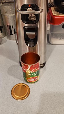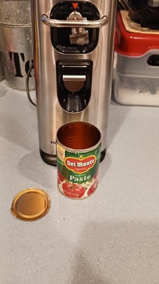 [This review was collected as part of a promotion.] This one works! There is a little bit of a learning curve to make sure the can is properly positioned. Once that is accomplished press the "OPEN" button, wait for the can to rotate completely, press the "RELEASE/RESET" button, while holding the can, and remove the now cleanly opened can. Remove the can lid and note no sharp edges. Easier than a pull top. The opener is a bit noisier than previous can openers I have had but worth it. Opened several cans easily with the exception of a small DelMonte tomato paste can. The top has a small indentation below the lid that proved troublesome. No problem, just open the can from the bottom. No indentation.