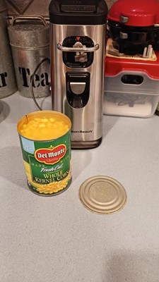 The Hamilton Beach® Smooth Touch™ Electric Can Opener cuts along the sides of cans, eliminating sharp lid edges, leaving you with smooth, touchable lids. This extra-tall can opener easily opens a wide variety of different-sized cans including taller cans. It opens both pop-top and regular cans with ease. The push-down lever makes it simple to align and open cans with one smooth action. Once the can opener starts cutting, it opens and holds the can in place until the release button is pressed for convenient one-handed operation. The high-carbon stainless steel blade is 10x stronger than the can to get the job done. The electric can opener's 3-in-1 design includes the can opener, built-in knife sharpener and a bottle opener, plus cord storage. Besides giving you the performance and durability you're looking for in a can opener, the Smooth Touch Electric Can Opener looks great on the kitchen countertop. Brought to you by America's #1 can opener brand.*