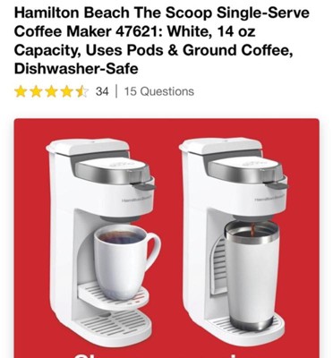 Hamilton Beach The Scoop Single-Serve Coffee Maker 47621: White, 14 oz Capacity, Uses Pods & Ground Coffee, Dishwasher-Safe