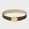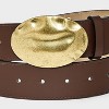 A: The belt features a hammer plaque buckle closure for secure fastening.