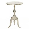 Bring a finishing touch to your home with an inviting appeal with this beautifully crafted accent table. A compact friendly table providing you with additional surface storage space any where in your home. Round pedestal accent table is best to arrange in the entryway or living area with books topped with glass vase with fresh flowers. This item ships in 1 carton. Suitable for indoor use only. Some assembly required. Maximum weight limit is 100 lbs. Made in India. This is a single silver colored end table. Traditional style.