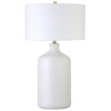 A transitional design sure to fit seamlessly into your space, this table lamp adds ambience to your nightstand, living room, workspace and more. Its ceramic base is finished with a matte exterior to suit any color scheme. The fixture is topped off with a crisp white fabric drum shade that perfectly complements the round base of the lamp.