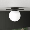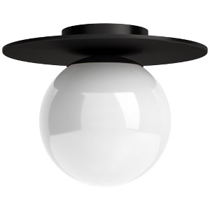 Pairing a modern canopy with a retro-inspired white milk glass globe shade, this flush mount ceiling light creates a classic mid-century look in your entranceway, hallway, or dining room. The enclosed glass shade diffuses light gently throughout your space without a glare. The metallic plate-shaped base artfully offsets the sleek orb, creating a clean on-trend look.