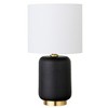 - Handcrafted matte black finish is applied to the round ceramic and metal base.