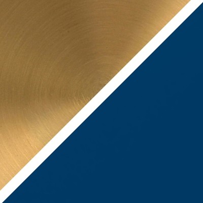 - Handcrafted blue and brass finish is applied to the round metal base.