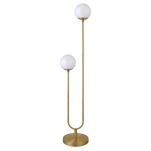 Achieve effortless retro styling in your space with this modern take on a classic Art Deco-inspired design. White milk glass globe shades provide soft ambient light and major vintage flair, while the sleek U-shaped base brings a modern touch to the piece. Finished in a warm metallic shade to blend seamlessly with your existing decor, this floor lamp will make a statement in any room.