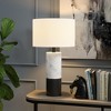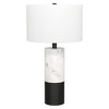 Evoke classical Italian décor with a glam modern edge with this striking table lamp. The color blocked pedestal base is an eye-catching combination of natural and manmade materials, featuring real Arabescato marble and a handcrafted metal accent. Topped with a crisp drum shade, this weighty fixture creates a stylish statement piece anywhere you use it.