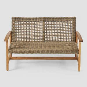Hampton Wicker Loveseat: Natural/Gray, Acacia Frame, Handwoven, Weather-Resistant - Christopher Knight Home