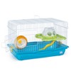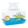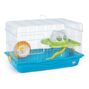 Prevue Pet Products Large Hamster Haven in Blue SP2005BL is a spacious and fun home for your hamster. Bi-level cage provides plenty of options for healthy activity and also satisfies your pets natural instincts to explore, hide and play above ground level. Multi-color components include platform, slide ramp, hideaway dome and exercise wheel. Featuring two access points, this vibrantly colored hamster cage has one front door and a larger, top-opening door. Cage measures 21 5/8" Long, 13 3/8" Wide and 14 1/4" High with 1/2" wire spacing.