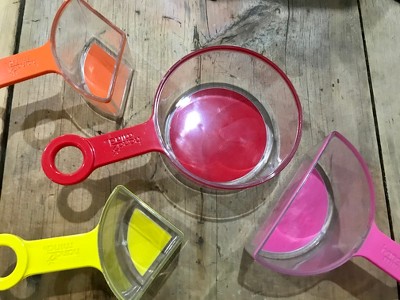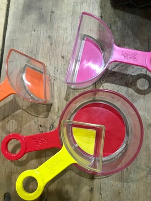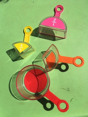 - Our Rainbow Measuring Cups match the same colors as the rest of our various types of fraction manipulatives, so kids continue to get more comfortable with different fraction sizes.