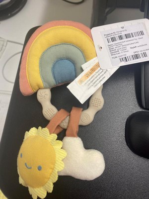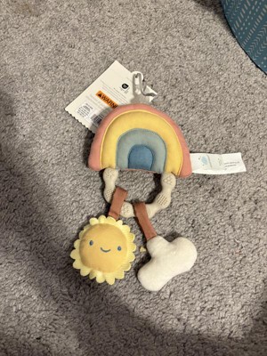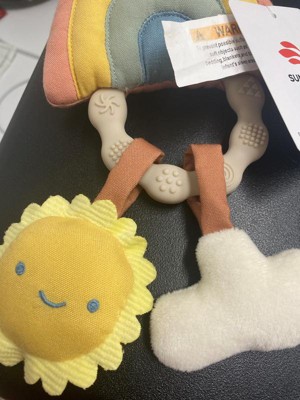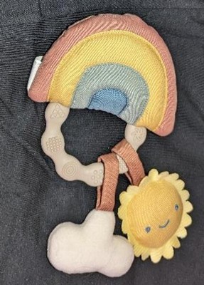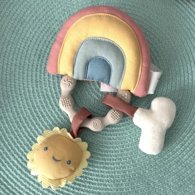 The design of this is very cute. I like the rainbow rattle and the little sun and cloud hanging down from the teething ring. It's not as soft as I thought it would be. Both the cushion aspect as well as the material. I think a plush material would be easier for little hands to grip, this is a little too smooth feeling and makes it difficult for a baby to grab onto. The rattle sound on the rainbow is subtle, which is nice. The sun sqeaks when pressed and the cloud is a crinkle sound. I like that it has the various sounds. All in all, it's cute and fun to play with, but I just wish the main part was a bit more squishy and softer to the touch.
