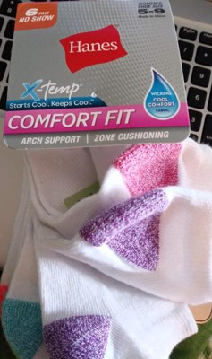 COMFORT IN EACH STEP These Hanes women's no-show socks have zone cushioning in the heel and toe to absorb shock - offering amazing protection for you and your feet. Comfort fit arch gives you a supportive fit around the foot, while Cool Comfort® moisture-wicking fabric keeps you cool and comfy. Plus, these women's no-show socks feature X-Temp™ technology, designed to adapt to your temperature for all-day comfort. Hitting just below the ankle, these no-show socks are the perfect match for low-cut sneakers and more. Stock up with this convenient 6-pack - giving you even more everyday options.