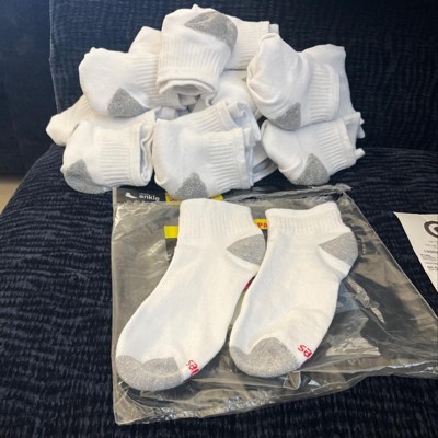 The Hanes Men's Ankle Length lightweight socks come in a super value pack of 20 pairs! This sock is like no other. It's lightweight for a "no bulk "experience, yet has heel/toe cushioning for added comfort where it matters. These socks are perfect for your "everyday "shoes and they are made from durable polyester fabric with a hint of spandex for a flexible fit. Zoned cushioning provides added comfort and support. Moisture wicking properties pull moisture away from your skin, keeping your feet dry. Available in a black pack and a white pack, these ankle socks fit shoe sizes 6-12. Limited time offer.