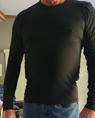 [This review was collected as part of a promotion.] This long sleeve black undershirt is extremely comfortable, and very warm. I live in southern California but took a trip to northern California and forgot my jacket. Temperatures were in the 50's at night and all I had was this undershirt, and thin 100% cotton dress shirts. I didn't need anything else as this shirt kept me very warm. The fit is close to the skin so you can wear it under any shirt no matter how form fitting. I am 6'4" and 195 with a 36" waist and I got a large. It fits snug on the arms and upper body, with a little loose in the waist. If you have big arms, it will fit, but be very snug. I normally shy away from synthetic materials, this is 87% polyester and 13% spandex, but it feels very comfortable. The length is just right for me to tuck the shirt in and have it stay. The only down side that I see in this product is the warmth. For me you need to be able to take it off if you are going inside or doing heavy physical activity in our temperate climate.
