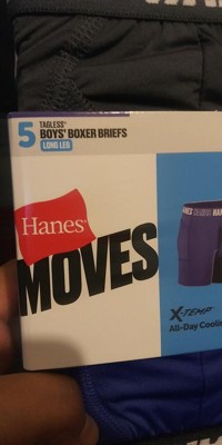 Featuring a quick-drying pouch and an anti-chafe gusset, lightweight Hanes Moves™ Boys' Long Leg Boxer Briefs provide the extra coverage he wants and the comfort he needs. Moisture-wicking fabric, odor control, and X-Temp™ technology match his energy level, teaming up to keep him feeling fresh and cool. He'll like the way the 4-way stretch fabric bends and flexes with him and will appreciate the handy utility pocket and smooth Tagless® interior. This tween long leg boxer brief underwear is available in a convenient assorted 5-pack - because you can never have too much of a good thing. Hanes Moves. Everyday comfort and performance solutions for boys.