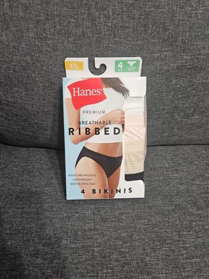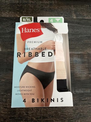 BIKINI UNDERWEAR THAT FLEXES TO FIT YOU Form and function come together with this Hanes Premium bikini underwear for women. The form is delivered via a trim bikini silhouette in an ultra-stretchy fabric that molds to your shape and stays put as you move. The coverage is not too low, not too high - it's just right with flattering high-cut legs and a full-coverage back. This style's function stems from an open work design for added breathability and a ribbed fabric that's both lightweight and soft. You'll love the smooth, no-line look under even clingy clothes and the moisture-wicking fabric that keeps you feeling cool and comfortable. Stock up with this convenient 4-pack and start enjoying the comfort of Hanes.