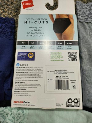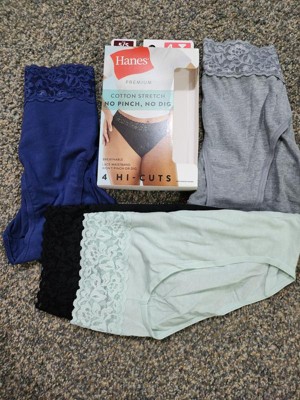 COMFORT IN EVERY DETAIL The perfect combo of comfort and style, this Hanes Premium women’s hi-cut underwear is sure to become your new favorite everyday panty. Made with fabric featuring the perfect amount of stretch, this women’s hi-cut underwear is both breathable and comfy. A classic leg-flattering cut with a full coverage back, this women’s panty will have you feeling confident all day long. With stay-in-place leg bands and a tag-free interior, this comfortable design allows you to move freely without any fuss. Say goodbye to panty lines, as well as pinching and digging - thanks to its soft floral lace waistband and smooth design. Plus, these women’s hi-cut panties are moisture-wicking, so you’ll stay cool - no matter what. Available in an assorted 4-pack, this hi cut panty is everything you could ask for in women’s underwear.