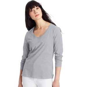 V IS FOR V-NECK We've updated this Hanes long-sleeve t-shirt, giving it a slimmer, more contemporary silhouette than our classic fit. Crafted from soft, U.S.-grown cotton with a flattering V-neck, this women's tee is everything you expect from Hanes. It has the look and feel of a high-end tee - minus the designer price tag.
