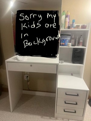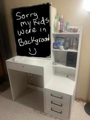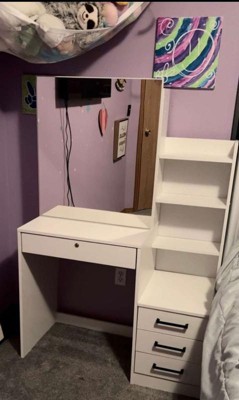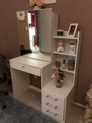 [This review was collected as part of a promotion.] I am in love with this vanity. There is so much storage space. My wife can fit all her makeup and hair stuff in it. It has 4 drawers and 3 shelves. There is also 2 shelves behind the mirror. The big drawer in front locks- which my wife loves so she can keep our toddler out of her good make up. Assembly was a bit difficult for my wife but she managed to get it done with very minimal help From me. It is heavy duty and made of good quality products and material.